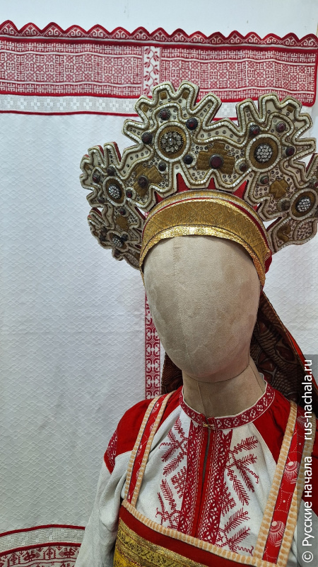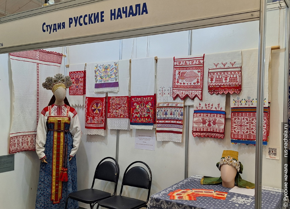 Наш выставочный стенд в самом начале выставки: на стенде представлены работы мастеров «Русских начал»: полотенца и костюм Шенкурского уезда Архангельской губернии, головной убор с. Безводного Нижегородской губернии.